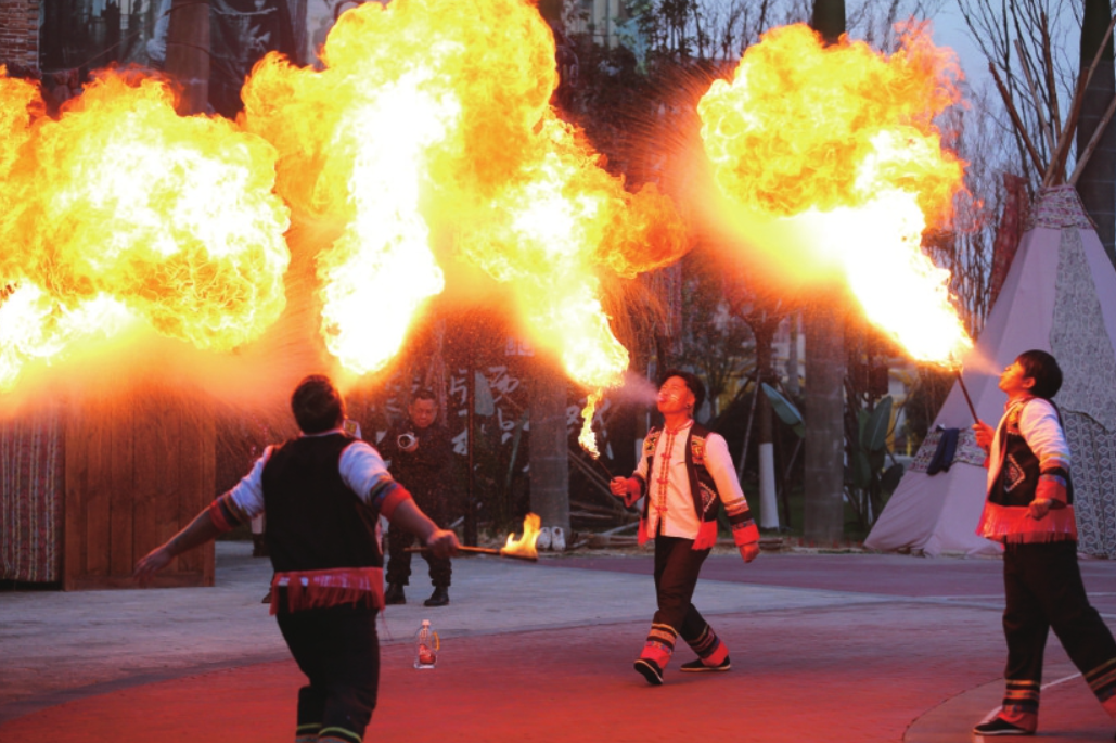演员在乐陵影视城表演喷火绝技。 梁孝鹏摄