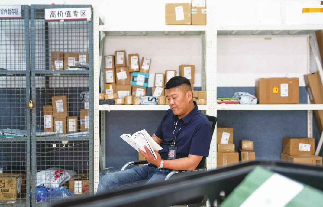 快递员在闲暇时拿出书籍认真品读