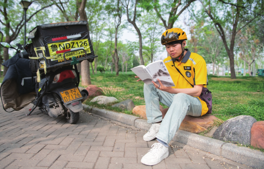 外卖小哥在公园休息时开启阅读模式