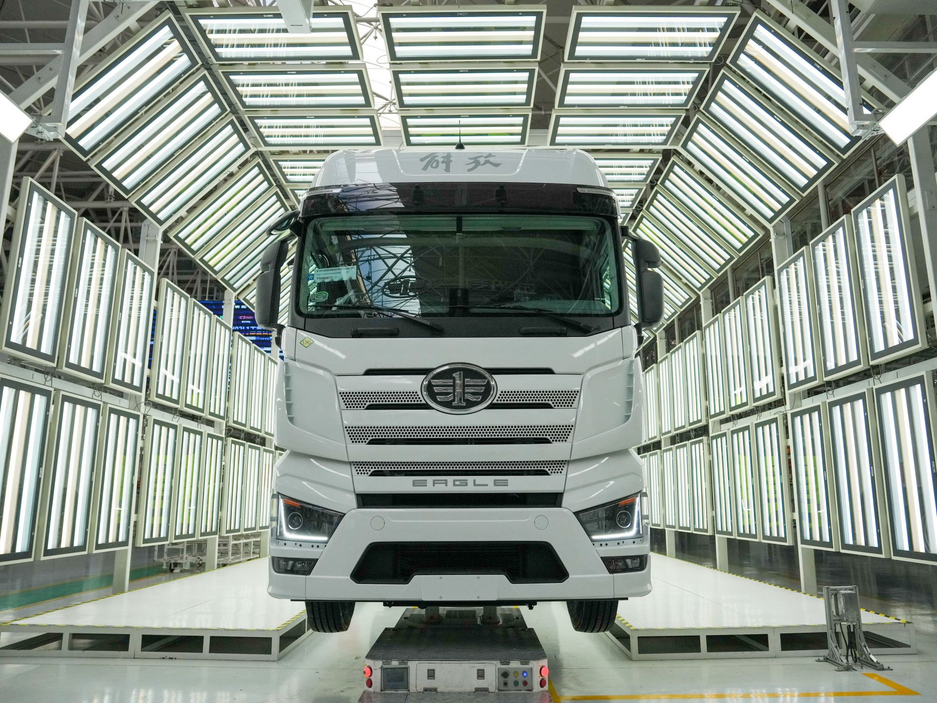 1月4日,在一汽解放J7整车智能工厂,车辆等待下线。