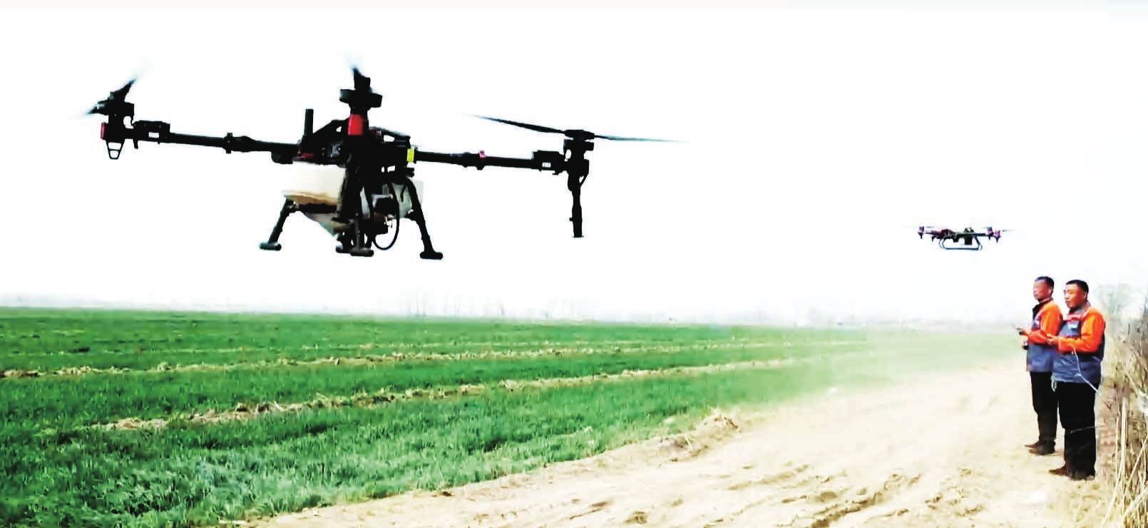 丁坞镇郭屯村的麦田中,植保无人机为小麦喷施返青拔节期专属的营养防病套餐