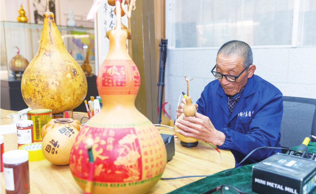 村民李荣第坐在手工创作区,手中的电烙笔在葫芦表面游走,一套动作下来,山水、花鸟、人物便跃然“葫”上。