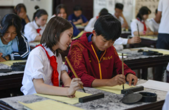 在新疆喀什地区疏附县托克扎克镇中心小学,来自贵州省黔西南布依族苗族自治州的青少年球员和小学生一起体验书法(2023年8月29日摄)。新华社记者 郝昭 摄