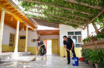 在新疆喀什地区疏附县阿亚格曼干村,村民阿卜都克尤木·肉孜(右)和妻子在打扫庭院(2022年6月10日摄)。新华社记者 丁磊 摄