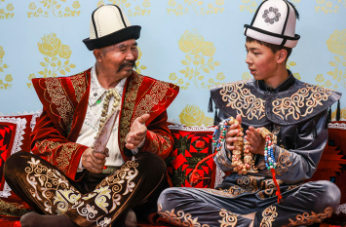 《玛纳斯》国家级非物质文化遗产代表性传承人江努日·图日干巴依(左)教徒弟演唱《玛纳斯》(2025年4月21日摄)。新华社记者 王菲 摄