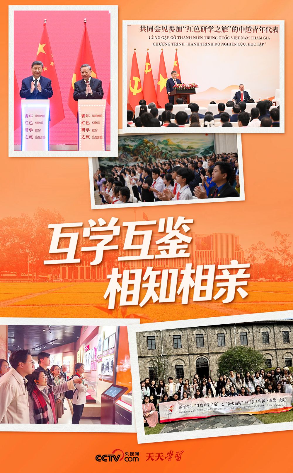 2025年4月15日,习近平总书记在访问越南期间宣布,中方将在今后3年邀请越南青年赴华开展“红色研学之旅”,沿着两党两国老一辈领导人的革命足迹,探寻中越友好的红色基因,感受中国式现代化的万千气象,为两国各自社会主义事业和构建具有战略意义的中越命运共同体凝聚青春力量。当日,中越两党两国领导人与双方代表共同按下按钮,启动“红色研学之旅”项目,为两国青年搭建起跨越国界、联结初心的友谊桥梁。