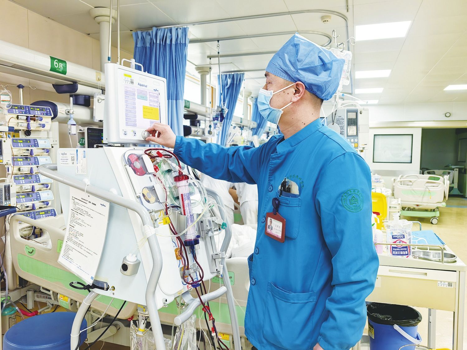 年轻护士迎上来求助。王风卫快步走到床旁,俯身查看管路,手指熟练地在操作面板滑动。经过调试,报警解除。这里刚结束,那边又有人喊:“鼻肠管置入困难,您来看看吧。”他转身又朝另一张病床走去。